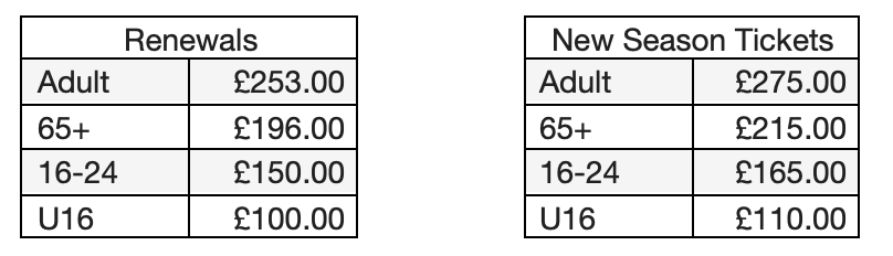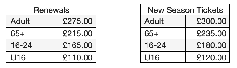 - £253 (excluding booking fee) for a full adult season ticket per season for 2026/27, 2027/28, 2028/29 - payable on or before 1st July in each relevant year.