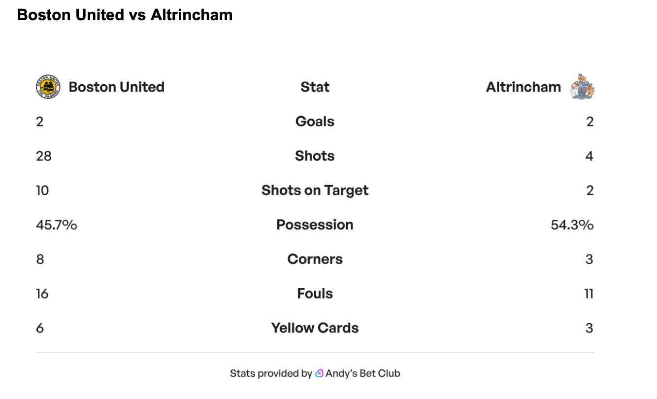 Although Altrincham dominated the ball in this fixture with 54% possession, it was Boston who were a lot more effective when they had the ball.