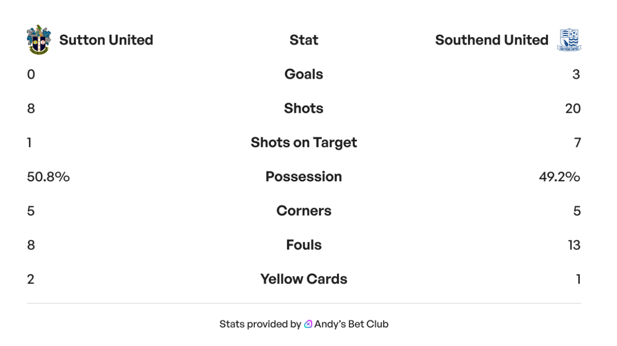 Andy’s Bet Club’s football analyst will break down Southend’s recent clash with Sutton to see what the statistics suggest about how they might set up against Solihull.