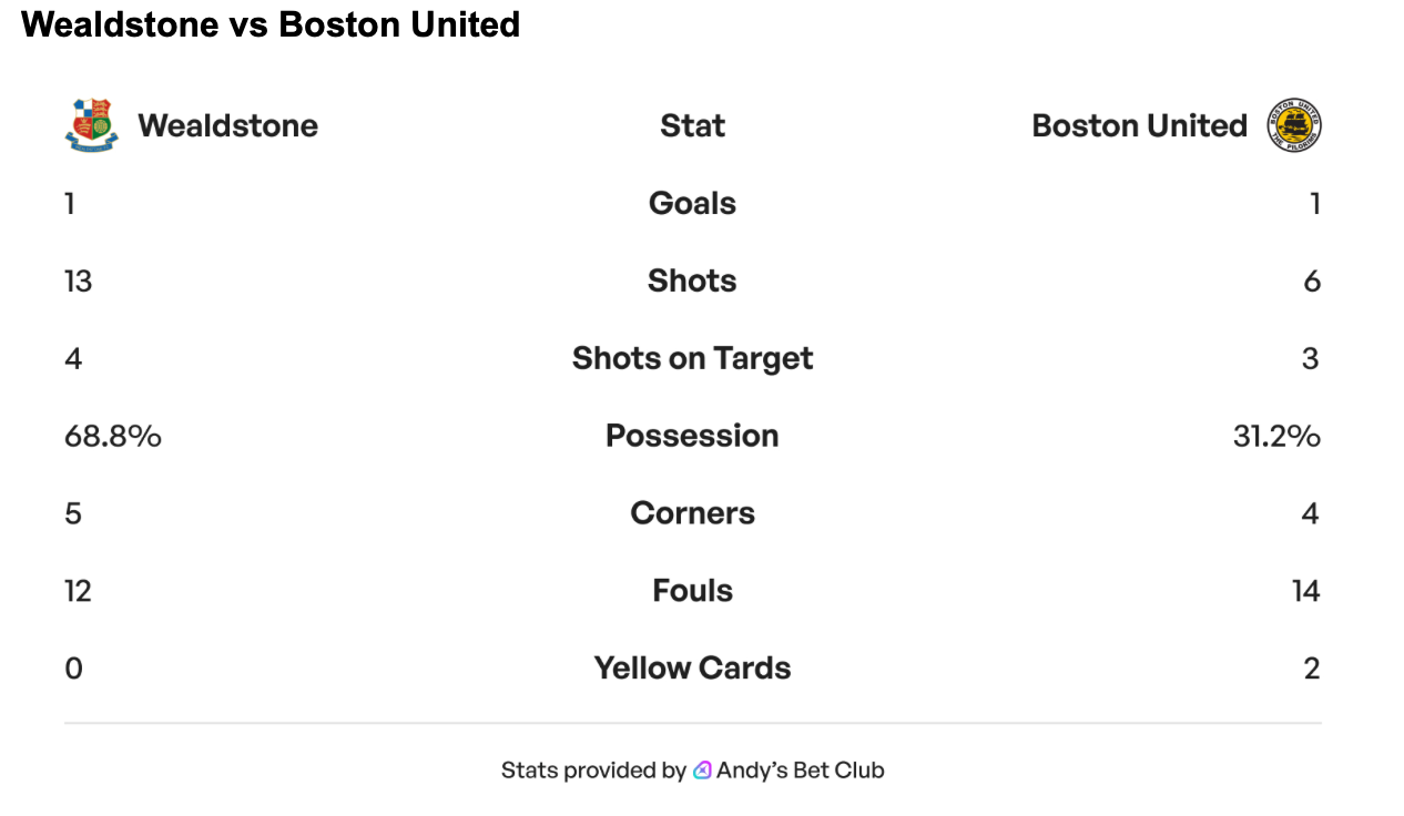 Wealdstone had 13 shots in the game, with 4 of those being on target, and they created an xG (expected goals) of 1.68. In comparison, Boston had just six shots with three on target, and they posted 1.35 xG.
